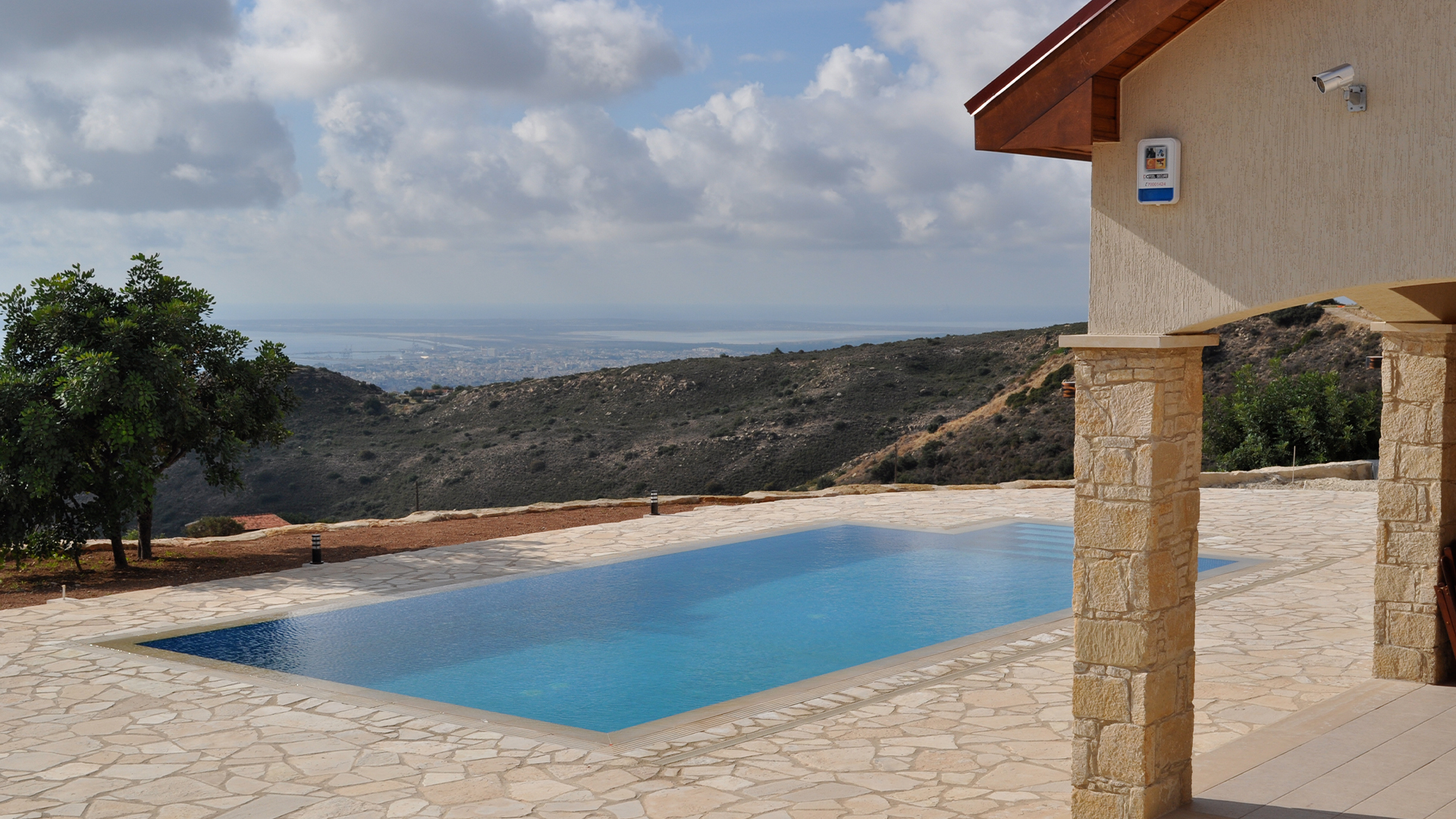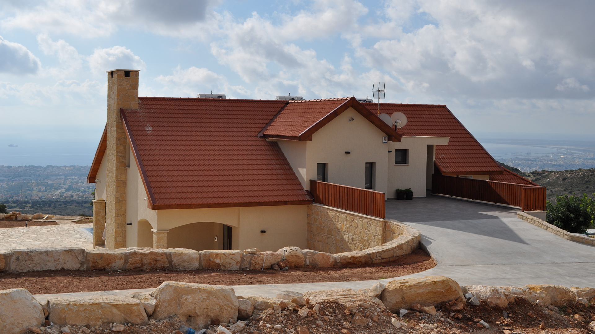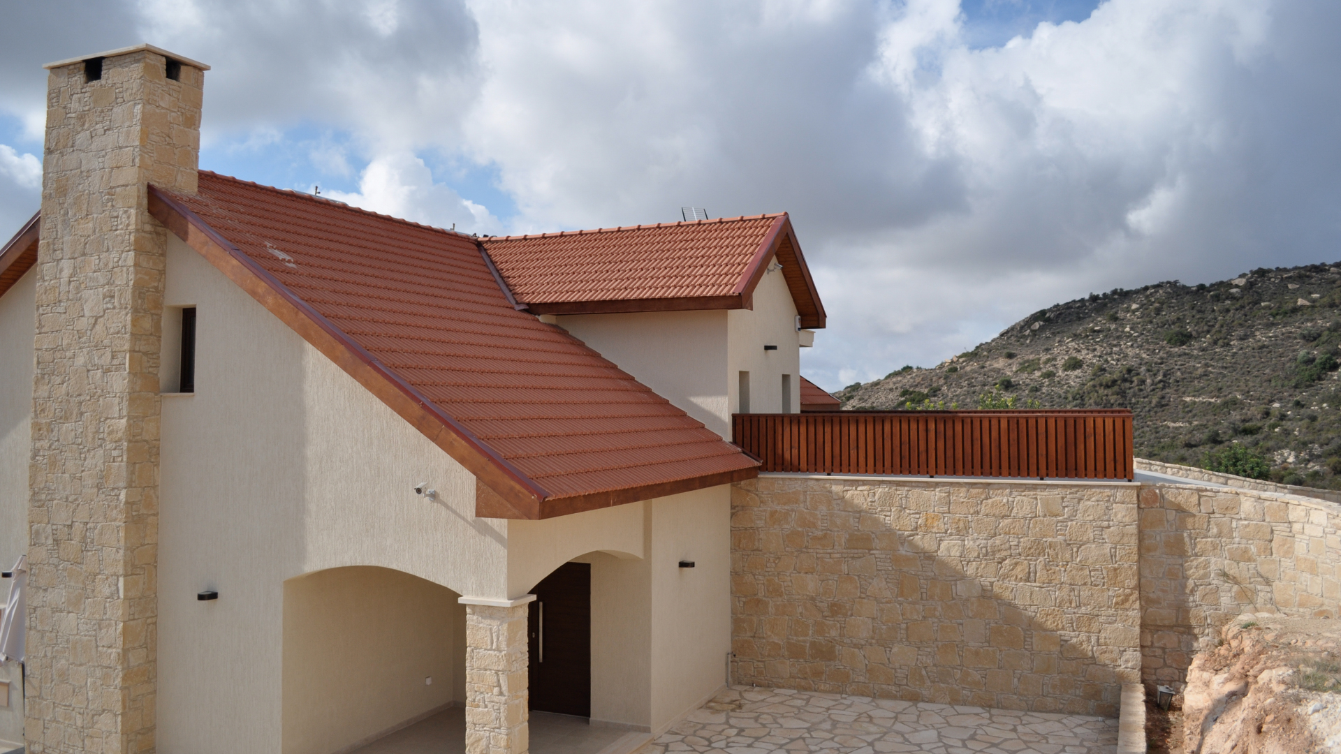This residence was constructed with a focus on quality craftsmanship and timeless design, featuring stone finishes, terracotta roofing, and spacious outdoor areas that integrate with the natural hillside setting.